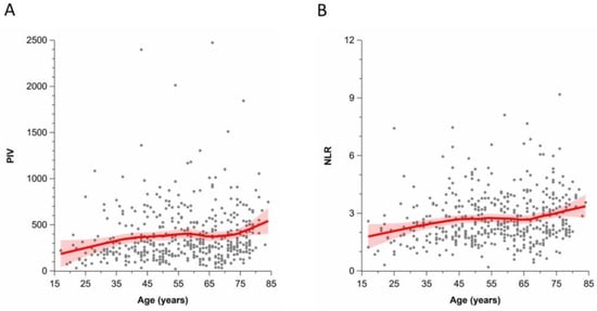Association between age at diagnosis of patients with cutaneous melanoma and the pan-immune inflammation value (PIV, (A)) and the neutrophil-to-lymphocyte ratio (NLR, (B)) (Spearman rank correlation coefficient 0.17 (95%CI 0.08–0.26) and 0.18 (95%CI 0.09–0.27), respectively); red bands indicate 95% confidence interval bands.