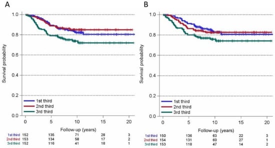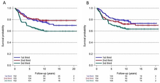 Kaplan–Meier curves for relapse-free survival of cutaneous melanoma patients and thirds of the pan-immune inflammation value (PIV, (A): 1st third-PIV ≤ 219.73; 2nd third-PIV > 219.73 to 393.73; 3rd third-PIV > 393.73) and the neutrophil-to-lymphocyte ratio (NLR, B): 1st third-NLR ≤ 2.02; 2nd third-NLR > 2.02 to 3; 3rd third-NLR > 3). 3rd thirds of PIV (A) and NLR (B) appear to be associated with poorer relapse-free survival (hazard ratio: 1.718, 95% CI 1.143 to 2.584 and hazard ratio: 1.702, 95% CI 1.104 to 2.623, respectively).