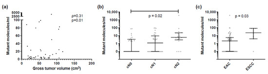 At least one tumor-specific mutation identified in the paired tissue analysis could be detected in plasma pre-CRT (T0) in 56% (44/78) of patients ( Supplemental Table S2 and Figure S1). In these patients with detected ctDNA, 74% (64/87) of tumor-informed mutations were detected. ctDNA was detected more often in patients with a more advanced tumor stage (81% in IIIB vs. 17% in IB, p = 0.05, Fisher exact) and patients with detected ctDNA had a significantly higher tumor volume (median 54 cm3 vs. 32 cm3, p = 0.02, Mann-Whitney) (Table 1). Absolute ctDNA levels (mean mutant molecules per ml plasma) were associated with tumor volume (ρ = 0.31, p = 0.01, Spearman rank) and were significantly higher in patients with cN2 disease compared to cN0 (p = 0.02, Kruskal-Wallis) and patients with ESCC compared to EAC, although ESCC numbers were small (p = 0.03, Mann-Whitney) (Figure 2).