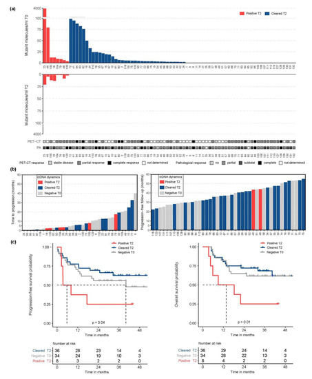 ctDNA dynamics and survival analysis: (a) ctDNA levels pre-CRT (T0) and preoperative (T2) combined with PET-CT response measurements and pathological response evaluation in grey. Patients are sorted according to ctDNA levels at T0 and presence of ctDNA at T2; (b) the time to progression (left panel) and progression-free follow-up (right panel); and (c) Kaplan-Meier analysis of progression-free survival and overall survival dividing patients according to ctDNA dynamics. Red ctDNA detected T0 and T2 (=positive T2); blue ctDNA detected T0, but not T2 (=cleared T2); grey ctDNA not detected T0 and T2 (=negative T0). Positron emission tomography-computed tomography (PET-CT), circulating tumor DNA (ctDNA).