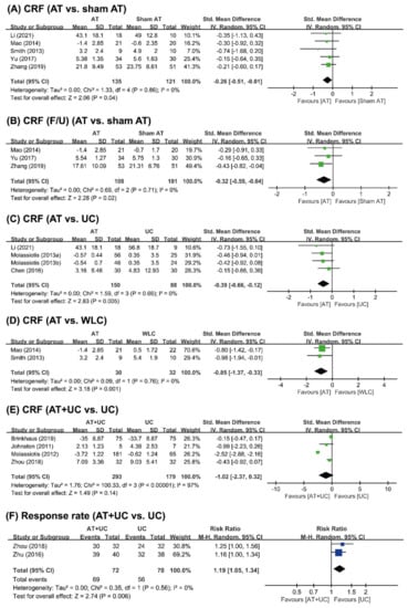 | Molassiotis (2012) [43] UK | 302/NR/off-treatment A: 52; B: 53 | (A) AT (1 time weekly for 6 weeks, n = 227/181) + (B) | (B) UC (n = 75/65) | MFI | MD −3.10 [−3.45, −2.75], p < 0.00001 | None/NCT00957112 |