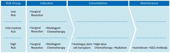 Current NB therapy in the majority of countries is constituted by three phases: induction, consolidation and maintenance therapies (Figure 1), and lasts approximately 18 months, varying by the patient risk [50,51]. Treatment strategies for each phase may include chemotherapy, surgical resection, high-dose chemotherapy with autologous stem cell rescue, radiation therapy, immunotherapy and isotretinoin, but the modality of the administration of the single procedures mostly depends on patient risk status [52]. Low- and intermediate-risk patients, for example, show high overall survival with minimal therapy approach, involving only surgical resection alone or combined with small chemotherapy administration in the induction phase [53,54,55]. On the other hand, the high-risk group need a more aggressive approach, and each phase is involved in the management of the pathology with the administration of any possible therapy available [52,56,57,58], being more challenging not only for the efficacy assessment, but also for the safety of the patient.