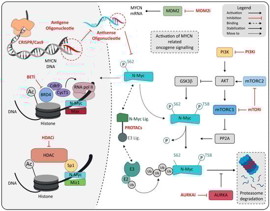 Schematic representation of drugs directly or indirectly targeting MYCN. Drugs are marked in red and reported as class, named on mechanism of action. Abbreviation: MDM2, murine double minute 2; PI3K, Phosphoinositide 3-kinases; PI3Ki, Phosphoinositide 3-kinases inhibitor; BETi, bromodomain and extra-terminal domain family inhibitor; BRD4, bromodomain-containing protein 4; mTORC1, mammalian target of rapamycin complex 1; mTORC2, mammalian target of rapamycin complex 2; mTORi, mammalian target of rapamycin inhibitor; PROTACs, proteolysis-targeting chimeras; MIZ1, MYC-interacting zinc-finger protein 1; HDAC, histone deacetylase; HDACi, histone deacetylase inhibitor; E3, E3 ubiquitin ligase; E2, E2 ubiquitin-conjugating enzyme; AURKA, Aurora kinase A; AURKAi, Aurora kinase A inhibitor; Ub, ubiquitin.