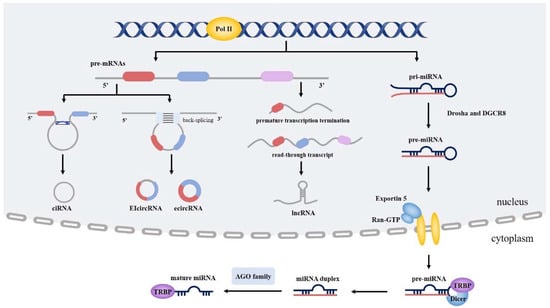 Biogenesis of ncRNAs. Abbreviations: AGO, argonaute; circRNA, circular RNA; ciRNA, intronic circRNA; ecircRNA, exonic circRNA; EIciRNA, exon–intron circRNA; lncRNA, long non-coding RNA; miRNA, microRNA; ncRNA, non-coding RNA; Pol II, RNA polymerase II; TRBP, TAR RNA binding protein.