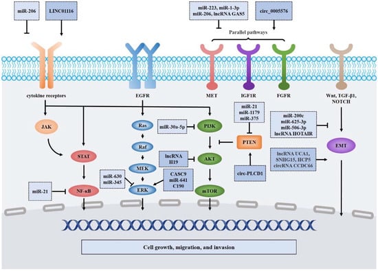Over the last few decades, ncRNAs have been deemed nonfunctional coproducts of protein-coding RNAs, even though they constitute the overwhelming majority of RNAs [,]. The advent of RNA-sequencing and analytical technologies has strongly enhanced the exploration of ncRNA biological functions and pathophysiological roles. On this account, ncRNAs are pyramidally utilized to illustrate the tumorigenesis and progression of malignancies, creating the conditions for in-depth research on the mechanisms of EGFR TKI-resistant lung cancer [,]. Emerging evidence has also shown that certain ncRNAs play an indispensable role in the regulation of critical signal pathways inducing EGFR TKI resistance, including PI3K/AKT/mTOR, Ras/Raf/MEK/ERK, JAK/STAT and EMT [,,,,].