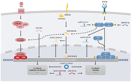EMT is a common cellular phenomenon that crucially leads to embryogenesis and malignant evolution. During tumorigenesis, EMT induces tumor cells to increase their invasive capability and resistance to therapeutic regimens, including chemotherapy and EGFR TKIs []. The EMT signaling pathways are predominantly composed of transforming growth factor-β (TGFβ), WNT and NOTCH pathways [,]. In the context of ncRNAs, however, EMT of EGFR TKI-resistant lung cancer is mainly restricted to the TGFβ pathway, NOTCH pathway and EMT-inducing transcription factors (Figure 3).
