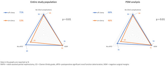 The aim of the present study was to compare perioperative surgical outcomes of the on-clamp and off-clamp approaches in patients who had undergone RAPN for cT2 renal masses. For this purpose, the achievement of the Trifecta (negative surgical margins, no postoperative major complications, and absence of sRFD) was used as a surrogate of surgical quality [16].