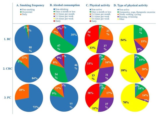 Frequency of smoking, alcohol consumption and physical activity/type in breast. 1. (A–D), colorectal 2. (A–D) and pancreatic cancer patients 3. (A–D). BC—breast cancer patients, CRC—colorectal cancer patients, and PC—pancreatic cancer patients.