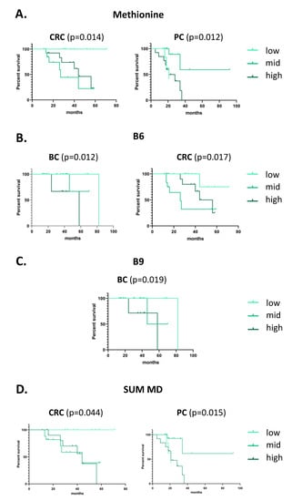 We examined whether different levels of methyl-donor intake could affect the overall survival of the patients, although the patient number was low. We found cancer type-dependent significant differences in the overall survival in the case of methionine, B6, B9 and the summative amounts of methyl-donor intakes (SUM MD). The low intake groups of methionine, B6 and SUM MD in colorectal cancer patients, which included the level of “RDA or lower” amounts of methyl-donors, had significantly longer overall survival (p = 0.014, p = 0.017 and p = 0.044, respectively) as plotted in Figure 4A,B,D. Similarly, the low B6 and B9 intake groups of breast cancer patients had longer overall survival than the other two groups (p = 0.012 and p = 0.019, respectively) (Figure 4B,C). In pancreatic cancer patients, however, the mid intake groups showed significantly higher overall survival in the case of methionine and SUM MD intakes (p = 0.012 and p = 0.015, respectively) as presented in Figure 4A,D.
