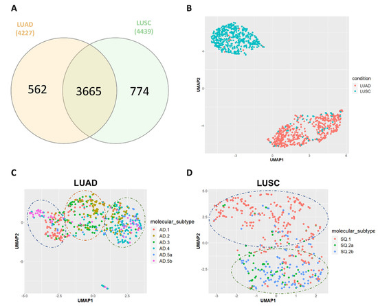 (A) Venn diagram showing the number of expressed HERVs identified exclusively in TCGA−LUAD, and TCGA−LUSC, and in common between two cohorts; (B) UMAP representation based on the top 100 most variable HERVs showing that TCGA−LUAD (red) and TCGA−LUSC (light blue) sample cohorts form two well-separated different clusters; UMAP representation based on the top 100 most variable HERVs in TCGA−LUAD (C) and TCGA−LUSC (D), showing the association between HERV expression and molecular subtypes.
