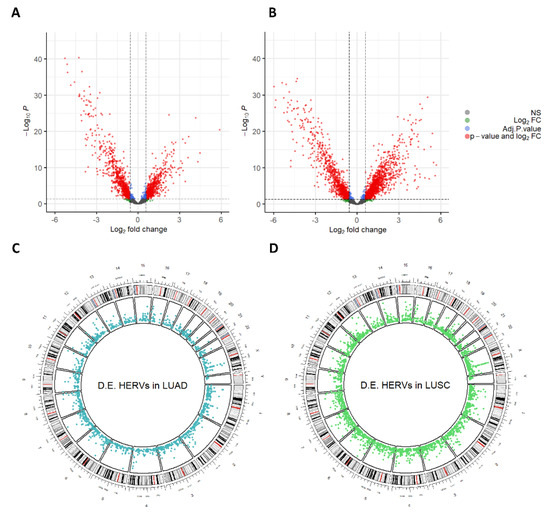 Volcano plots showing the distribution of the differentially expressed HERVs (red) identified in TCGA−LUAD (A) and TCGA−LUSC (B) in a two-dimensional space where the Y-axis is the significance (−Log10P.value) and the X-axis is the magnitude of the change (Log2FC); Circos plots showing the distribution of the differentially expressed HERVs identified in TCGA−LUAD (C) and TCGA−LUSC (D) across all human chromosomes.