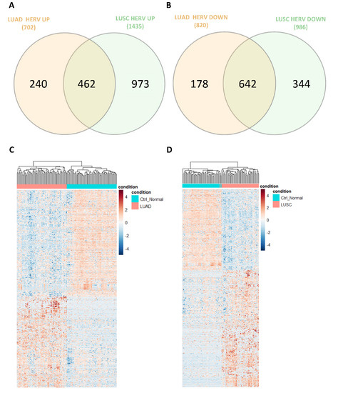(A) Venn diagram showing the number of up-regulated HERVs identified exclusively in TCGA−LUAD, and TCGA−LUSC, and in common between these two cohorts; (B) Venn diagram showing the number of down-regulated HERVs identified exclusively in TCGA−LUAD, and TCGA−LUSC, and in common between these two cohorts; heatmap drawn by using the scaled counts (RPM) of the differentially expressed HERVs identified in TCGA−LUAD (C) and TCGA−LUSC (D) cohorts with their samples clustered accordingly with the Pearson correlation distance.