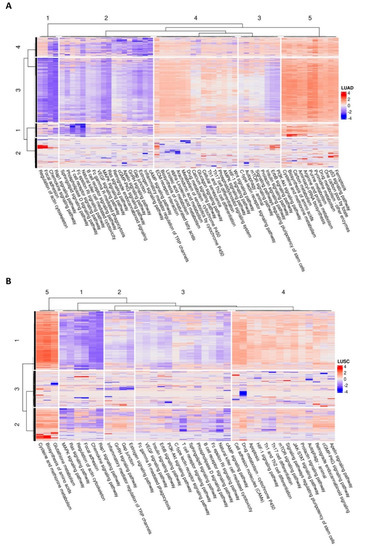 In conclusion, the clustering analysis on the HERV-specific pathway analysis results identified four main clusters of HERVs in TCGA-LUAD and three main clusters of HERVs in TCGA-LUSC, in which within the clusters, HERVs seem to impact the enriched pathways similarly (the list of HERVs for each of these clusters in both TCGA-LUAD and TCGA-LUSC can be found in Supplementary File S7). Moreover, in TCGA-LUAD, we observed a higher percentage of HERVs belonging to the HERV-H, HERV-K, and MER4 families in the fourth cluster compared to the other clusters, while in TCGA-LUSC, we observed a higher percentage of HERVs belonging to the HERV-H family in the second cluster, and HERV-K in the first cluster. On the other hand, the other HERV families were more similarly distributed along the clusters. Tables S3 and S4 show the top 10 dysregulated HERV-families for each cluster identified in TCGA-LUAD and TCGA-LUSC cohorts, respectively.
