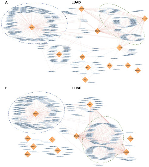 Correlation networks showing the connections between HERVs and a list of selected oncogenes and adaptive immunity regulators in TCGA−LUSC (A) and TCGA−LUSC (B). In the networks, the blue nodes represent the HERVs and the orange nodes represent the genes.