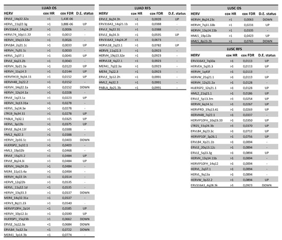 Tables showing the list of HERVs statistically associated with overall survival (OS) and relapse-free survival (RFS) in both TCGA−LUAD and TCGA−LUSC cohorts. In more detail, Cox hazard ratios (HR), and Cox false discovery rates (FDR) values are reported. In addition, it is also reported for each HERV if it has been found up−regulated (up) or down−regulated (down) during the paired tumor vs. normal differential HERV expression analysis.