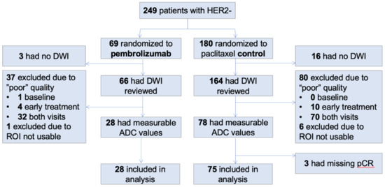 A total of 249 patients were considered for inclusion in the analysis. One hundred and eighty patients were randomized to be the controls and 69 patients to the pembro. Figure 1 shows a flowchart of data exclusion and inclusion. In summary, 103 total patients were included in the analysis (75 in controls and 28 in pembro) and the majority of the exclusions (117 patients in total) are due to the poor quality of DWI at either or both T0 and T1. The patient characteristics of the excluded and included cohorts are shown in Table 1. The included patients were on average 3 years younger than those who were excluded (p = 0.004). Race, HR/HER2 subtype, treatment, or menopausal status between the included and excluded cohorts were balanced between the two groups.