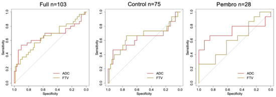 The AUCs for the percent change of FTV were estimated as 0.65 (95% CI: 0.52 to 0.78), 0.66 (95% CI: 0.47 to 0.85), and 0.61 (95% CI: 0.39 to 0.83) in the full cohort, control, and pembro, respectively (Table 3). Figure 3 displays the ROC curves for ADC and FTV. The biggest separation of two ROC curves was observed in the pembro cohort, suggesting a higher performance for ADC in this cohort.