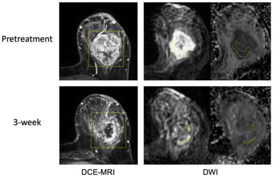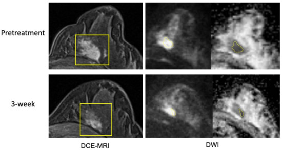 Example case 1 with a pathologic complete response. The patient was treated by paclitaxel + pembrolizumab followed by cyclophosphamide. Representative MR images are shown from pretreatment (top row) and at 3-week (bottom row). Images from DCE-MRI were acquired 144 s after the contrast injection. Images from DWI are shown in a pair of original DWI (b = 800 s/mm2) and ADC map. ROIs are shown in yellow (rectangular box in DCE and hand-drawn in DWI).