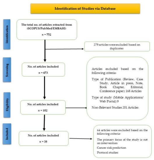 A total of 752 articles were retrieved from Embase, Scopus, and PubMed. After the removal of the duplicates, 473 articles were evaluated. Finally, of the 473 articles, the full texts of 102 relevant articles were reviewed. At this stage, the articles were screened based on their study characteristics, including the type of wearables and their usage, and the primary focus of the study. The exclusion criteria are mentioned in the methodology and presented in Figure 1. Finally, 38 studies that met the inclusion criteria were included in this scoping review.