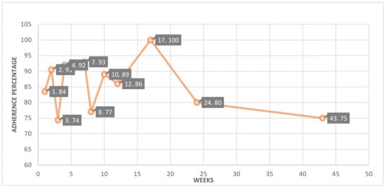 The adherence during the intervention periods was visualized graphically using SPSS. Figure 2 shows the adherence rate to the exhibited intervention duration. All of the studies were divided into 11 segments based on the duration of each study’s intervention. The average adherence percentage was calculated for each segment. The intervention-based segments included studies with weeks 1 [,], 2 [,], 3 [,,], 4 [,,], 7 [], 8 [,,], 10 [,,], 12 [,,,,,,,,,,,,,,,], 17 [], 24 [,] and 43 []. In the graph, (1.84) indicates the studies grouped in this segment that had a one-week intervention with an average adherence of 84%. According to our analysis, 16 out of 38 studies used a 12-week intervention period with an average adherence of 86% (Figure 2) [,,,,,,,,,,,,,,,]. The follow-up periods in the reported studies were calculated by subtracting the intervention duration from the total study duration. There are only five studies with a 12-week follow-up period, accounting for 24 weeks of total study duration. These studies showed an average adherence rate of 91% [,,,,]. Studies with an intervention period of 4 or 7 weeks also observed high adherence to WDs (i.e., 92% and 93%, respectively) [,,,] (Figure 2). There is one unique study that enrolled patients across four seasons of the year. This study showed a 100% adherence rate throughout the 52-week study duration []. The adherence outcomes are summarized in Table 2.