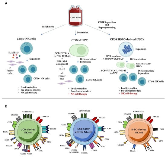 UCB is an important source of CD34+ HSPCs to obtain NK cells. Several in-vitro models of NK cell differentiation from CD34+HSPCs have been optimized and all of them have represented a powerful tool for several purposes. First, they have provided a unique opportunity to understand the mechanisms sustaining and regulating NK cell development [33,36]; second, they give hints to evaluate the UCB CD34+-derived NK cell therapeutic potential in preclinical analyses [126,127,128], and third, they provide the basis for the “off the shelf” NK cell generation for adoptive immunotherapy [8,9,129].