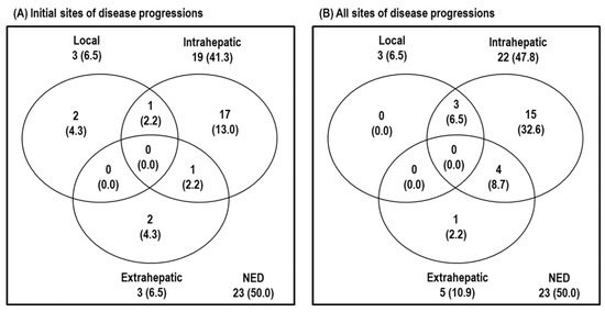 Of the 46 patients, 31 patients are still alive, and 15 patients died from disease progression (n = 11), underlying chronic renal failure (n = 2), and unknown causes (n = 2). Disease progression developed in 23 of 46 (50%) patients. The initial sites of disease progression were local sites in three (6.5%) patients, intrahepatic sites in 19 (41.3%) patients, and extrahepatic sites in three (6.5%) patients, and all of the sites of disease progression were local sites in three (6.5%) patients, intrahepatic sites in 22 (47.8%) patients, and extrahepatic sites in five (10.9%) patients (Figure 1).