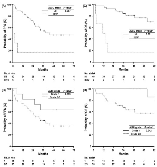 Progression-free survival (PFS) curves according to AJCC stage (A) and ALBI grade (B) in all patients, and overall survival (OS) curves according to AJCC stage (C) and ALBI grade (D). Abbreviations: AJCC stage, American Joint Committee on Cancer stage; ALBI grade, albumin-bilirubin grade. * log-rank test.