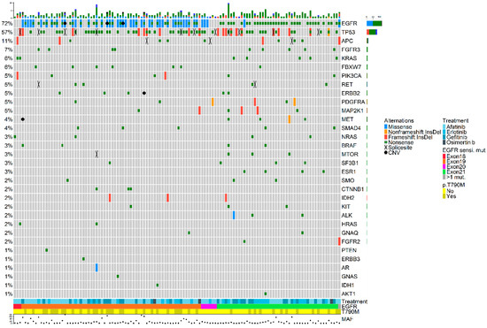 - Hong, S.; Gao, F.; Fu, S.; Wang, Y.; Fang, W.; Huang, Y.; Zhang, L. Concomitant Genetic Alterations with Response to Treatment and Epidermal Growth Factor Receptor Tyrosine Kinase Inhibitors in Patients with EGFR-Mutant Advanced Non-Small Cell Lung Cancer. JAMA Oncol. 2018, 4, 739–742. [Google Scholar] [CrossRef] [PubMed]