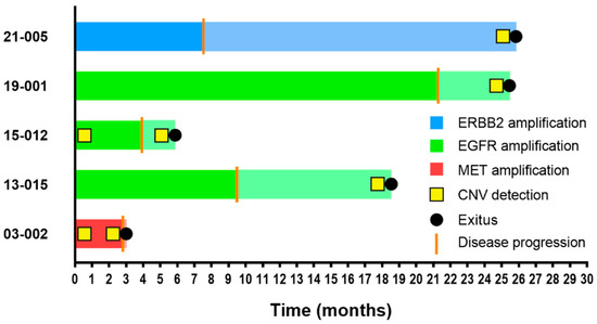 Lastly, CNVs in EGFR (n = 3), MET (n = 1), and ERBB2 (n = 1) were detected in five cases. These CNVs were absent in the pretreatment samples in three cases but were detected at baseline in two cases with MET and EGFR amplification. Patients in whom CNVs were detected at baseline showed the shortest PFS (2.8 and 3.9 months), suggesting primary resistance through amplification of MET or EGFR, respectively (Figure 2 and Table S2).