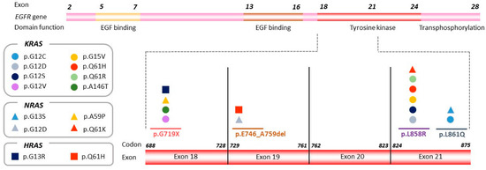 KRAS, NRAS, and HRAS mutations detected by NGS according to exon location of the original EGFR-sensitizing mutation. The EGFR gene is represented, and the region including exons 18–21 is magnified in order to show the distribution of KRAS, NRAS, and HRAS variants detected in the plasma sample upon disease progression (represented by circles, rectangles, and squares, respectively), according to exon location of the original EGFR sensitizing mutation.
