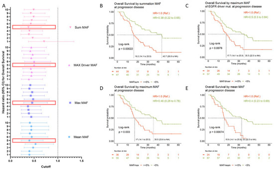 The prognostic value of circulating tumor DNA (ctDNA) levels was evaluated using different methodological approaches. To this aim, we calculated the mean, maximum, and sum of MAF from the set of all detected variants for each sample, and we established different MAF thresholds (ranging from 1% to 10%). In addition, the prognostic value of the MAF of the original EGFR-sensitizing mutation was tested. As presented in Table 4 and Figure 4A, the amount of ctDNA was of prognostic significance regardless of the approach used. Overall, patients with high ctDNA at disease progression had significantly worse OS than those patients in which the opposite situation occurred (Table 4 and Figure 4A). Kaplan–Meier curves for the <5%MAF cutoff are shown in Figure 4B–E. Using a cutoff of sum MAF < 5%, the median OS was 16 months (95% CI: 14 to 21.2) in patients with high ctDNA levels (MAF ≥ 5%) compared with 43.7 months (95% CI: 23.6 to NR) for patients with ctDNA levels below that cutoff.