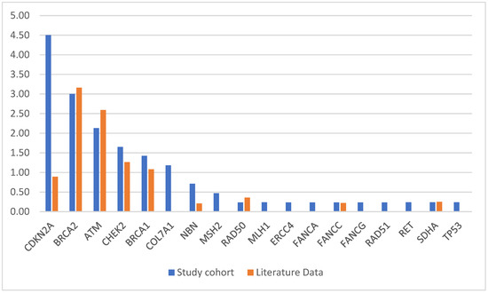 Seventy out of 422 enrolled patients (17%) carried one or more pathogenic variant (PV) in at least one of the 51 genes included in the panel (Table 1). CDKN2A was the most frequently mutated gene (19/422; 4.5%), confirming the founder p.Gly101Trp as the most frequent PV in our series (11/19 = 57.9%) [36]. For this reason, CDKN2A in our cohort shows a higher frequency compared to the literature data [37] (Figure 1).