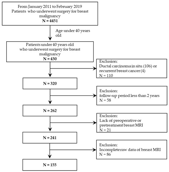 From January 2011 to February 2019, among 4451 patients who underwent breast cancer surgery in our institution, 320 female patients under 40 years old who were diagnosed with invasive breast cancer were consecutively included. Because pretreatment breast MRI was used to create the radiomics signature, patients without pretreatment MRI (n = 21) or patients with incomplete MR data (n = 86) were excluded. To investigate the DFS rates two years after surgery, patients with less than two years of follow-up (n = 58) were excluded. Patients who had not been diagnosed with recurrent breast cancer by the end of five years were censored.