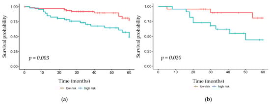 Using Kaplan–Meier survival analysis, the DFS by Rad-score was analyzed. The high-risk group in the training set showed significantly lower DFS values within 2 years of surgery (p = 0.003). Similarly, the high-risk group showed significantly lower survival rates in the validation set (p = 0.020) (Figure 2).