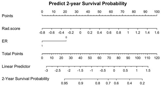 Univariate analysis showed that a higher Rad-score (p < 0.001) and ER-negativity (p = 0.044) were associated with recurrence. Multivariate analysis confirmed the independent association of Rad-score (hazard ratio 5.87, 95% CI 2.87–11.99, p < 0.001) and ER-negativity (hazard ratio 0.41, 0.19–0.86, p = 0.019) with disease recurrence (Table 3). With Rad-score and ER-negativity, the Rad-score-based nomogram for the prediction of disease recurrence within 2 years of surgery was created (Figure 3).
