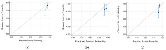 (a) Calibration curve of the radiomics nomogram in the training set; (b) Calibration curve of the ER-negativity-only model in the training set; (c) Calibration curve of the Rad-score-only model in the training set.