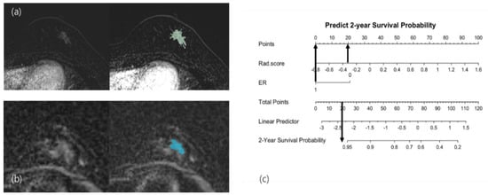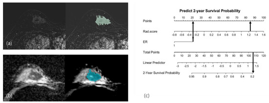 Nonrecurrence case: A 37-year-old woman with grade 2 invasive breast cancer of the hormone receptor-positive subtype. After segmentation of the mass in (a) the contrast-enhanced subtraction T1-weighted images and (b) the ADC map, the Rad-score based on texture analysis was calculated as −0.345. (c) Applying this score and ER-positivity in the radiomics nomogram, the total points were calculated as 20, which showed a probability of recurrence survival of more than 95%. The patient underwent breast-conserving surgery with adjuvant chemotherapy and hormone therapy. The patient remained stable, without recurrence. (ER: estrogen receptor; ADC: apparent diffusion coefficient.)