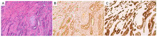 Representative hematoxylin and eosin section of a uterine carcinosarcoma (A) and immunohistochemical expression of P53 (B) and cytokeratin-7 (C) with a serous epithelial component.