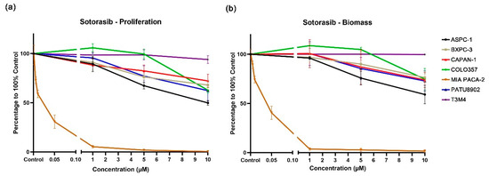 Proliferation (a) and biomass (b) changes in PDAC cell lines after exposure to different concentrations of sotorasib.