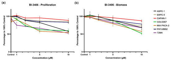 Proliferation (a) and biomass (b) changes in PDAC cell lines after exposure to different concentrations of BI-3406.