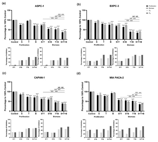 Cell proliferation and biomass of ASPC-1 (a), BXPC-3 (b), CAPAN-1 (c), and MIA PACA-2 (d) after 72 h sotorasib, trametinib, buparlisib or inhibitor combination exposure, as well as analysis of synergistic effect using Bliss independent model. Data are presented as mean ± SD. Significance of a treatment effect compared to the DMSO control was determined by one-way ANOVA and displayed as *: p < 0.033, **: p < 0.002, ***: p < 0.001 (n ≥ 3). The significance of the treatment effect for double inhibition compared to triple inhibition was determined by one-way ANOVA and was shown as # (proliferation), § (biomass): p < 0.033; §§: p < 0.002, ###; §§§: p < 0.001. S: sotorasib; T: trametinib; B: buparlisib; NS: not significant; EP: predicted inhibition by Bliss independent model; EO: observed inhibition.