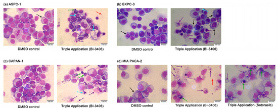 Examination of PDAC cell line morphology changes was carried out by Pappenheim staining. After 72 h of exposure to the vehicle control, single inhibitor, or combined inhibitor, supernatants were collected and cells were harvested. After counting the cells, we resuspended the cell pellet and adjusted the cell density of the control group and each experimental group to 5 × 104 cells/200 µL. Then, 200 µL of the cell suspension was fixed on a glass slide using Shandon Cytospin 3 centrifuge (Shandon, Frankfurt/Main, Germany), and two cell slides were made for each group. After 24 h of air-drying, the slides were stained with May–Grünwald solution (Merck, Darmstadt, Germany) for 6 min, washed with phosphate buffer solution (pH = 7.2) (Merck) three times for 1 min, then stained with Giemsa solution (1:10) (Merck) for 20 min, and washed with phosphate buffer solution three times for 1 min again. After the slides were air-dried for 24 h, the morphology of cells was examined and visualized with Evos XL Core Imaging System (Life Technologies, Darmstadt, Germany), magnified 100 times. Each experiment was repeated 3 times to eliminate random errors.