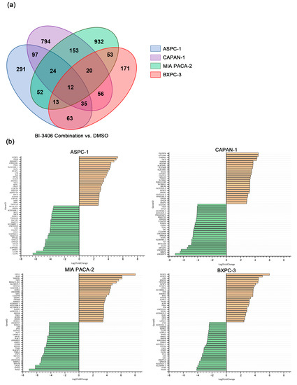 Number and overlap of DEGs in ASPC-1, BXPC-3, CAPAN-1 and MIA PACA-2 cell lines after exposure to BI-3406 combination (a) and the top 25 up- and down-regulated genes before and after BI-3406 combination exposure (b).