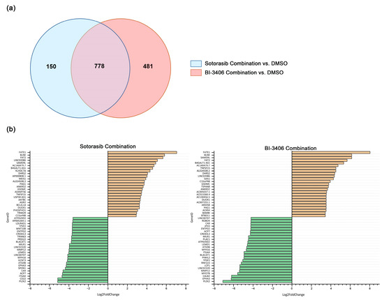 Number and overlap of DEGs in MIA PACA-2 cell lines after exposure to sotorasib combination or BI-3406 combination (a) and the top 25 up- and down-regulated genes before and after inhibitor combination exposure (b).