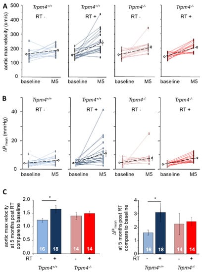 Evolution of the maximal aortic valve jet velocity and mean pressure gradient after radiation treatment. (A) Maximal aortic valve jet velocity measured at baseline and 5 months after irradiation treatment (RT+) or not (RT−) in Trpm4+/+ and Trpm4−/− mice. Plain lines indicate paired data for the same mouse at baseline and 5 months. Dotted lines and open circles indicate the mean ± S.E.M for each group. (B) Mean pressure gradient (ΔPmean) measured at baseline and 5 months as explained in A. (C) For each mouse, maximal aortic valve jet velocity (left) as well as ΔPmean (right) measured at 5 months post-treatment was reported compared to that of baseline (4-month-old mice). Histograms indicate the mean ± S.E.M. for each group. In all figures, numbers in bars indicate the number of animals and * indicates a significant difference between groups (p < 0.05).