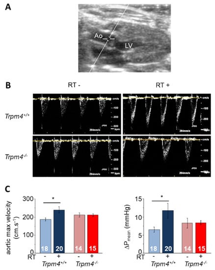 Functional valvular remodeling 5 months after radiation treatment. (A,B) Examples of transthoracic echocardiography in the Doppler mode for Trpm4+/+ and Trpm4−/− without (RT−) or with (RT+) irradiation at 5 months post-treatment on anesthetized 9-month-old male mice. Measurements were made at the aortic valve level to reveal aortic flux velocity. The image provided in A allows to visualize where the measurements were taken. LV (left ventricle); Ao (aorta). (C) Mean maximal aortic valve jet velocity (left) and mean pressure gradient (ΔPmean) (right) for each group according to the echocardiography. Data are expressed as mean ± S.E.M. * indicates a significant difference between groups (p < 0.05).