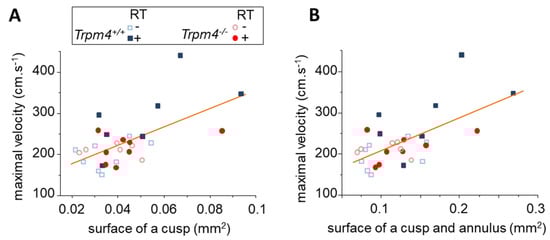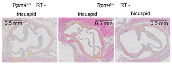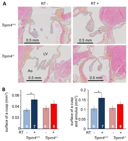 Beside the effect of irradiation, a learning from our study is the absence of significant aortic valve dysfunction in Trpm4−/− mice, since these animals have cusp surface and aortic flux parameters similar to the wild type. Note that valvular morphological parameters measured for wild-type mice in our study were similar to those previously reported for animals of the same age (9 months) in another study [22]. However, it is intriguing that in our experiments where transversal slicing was performed, we detected 2 Trpm4−/− mice with apparent bicuspid aortic valve over the 12 animals used (17%) while none were detected over the 19 Trpm4+/+ mice. According to the small number of animals, it does not reach significance, however, a recent review of the literature based on 1823 mice reported that a bicuspid aortic valve in mice occurs in only 0.3% of wild-type animals [51]. Even more, specifically in the studies using C57BL/6 mice similar to the strain used in our study, only 2/366 animals exhibited bicuspid aortic valves [51,52]. It thus indicates that the bicuspid valve is rare in C57BL/6 mice. This occurrence (2/366) is significantly different from that observed in Trpm4−/− mice from our study (2/12), according to the Fisher exact test. It is thus conceivable that TRPM4 participates in the development of the aortic valve even if this remains to be confirmed in a larger population. This is, to our knowledge, the first description of valvular malformation in Trpm4−/− mice.