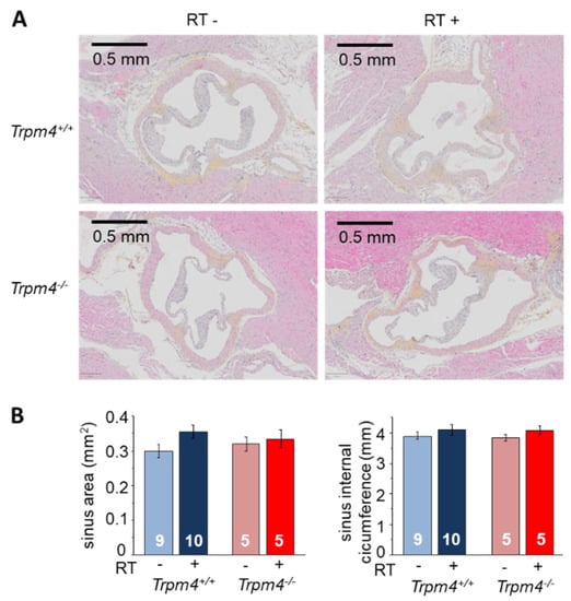 Aortic sinus remodeling was evaluated on hearts sliced in the transversal axis to reveal the entirety of the sinus (Figure 5). The sinus area (tissue area) was not significantly different between Trpm4+/+ and Trpm4−/− animals in the absence of irradiation. Irradiation induced an increase in aortic sinus area from Trpm4+/+ mice, even if not reaching significance, but not in Trpm4−/− animals. No variation in sinus internal diameter was induced neither by gene disruption nor irradiation (Figure 5).