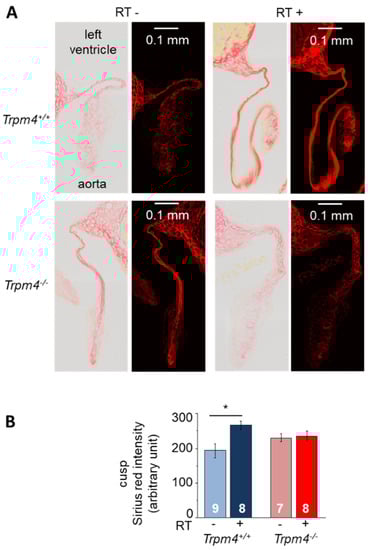Fibrosis was first evaluated by Sirius red staining on aortic valve cusps using longitudinal heart slices. Staining intensity in the cusp area was significantly increased by 38% in irradiated Trpm4+/+ mice compared to non-treated controls while no significant effect of irradiation was detected on Trpm4−/− animals (Figure 6).