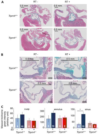 Fibrosis was also evaluated using Masson trichrome staining on transversal slices. Cusp as well as annulus labeling was increased in irradiated Trpm4+/+ mice even if not reaching significance while no effect of irradiation was observed on Trpm4−/− animals (Figure 7). On the other hand, labeling of the sinus was significantly increased by 4-fold after irradiation in the Trpm4+/+ mice but no effect was detected in Trpm4−/− animals (Figure 7).